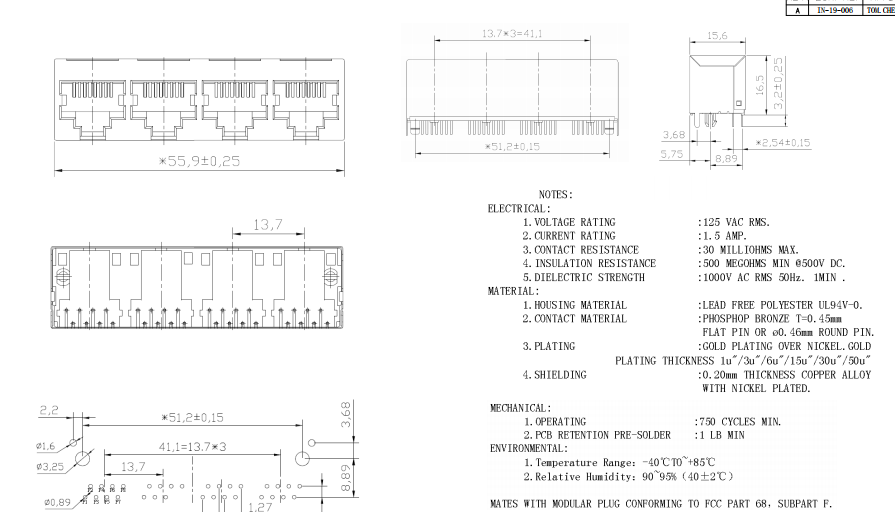 RJ45 Connector 1x4 Port 8P8C Without LED Vertical Module Jack數(shù)據(jù)手冊PDF下載