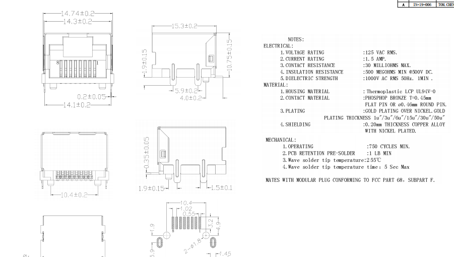 RJ45 Connector 1x1 Port 8P8C Without LED SMT Module Jack數(shù)據(jù)手冊(cè)PDF下載