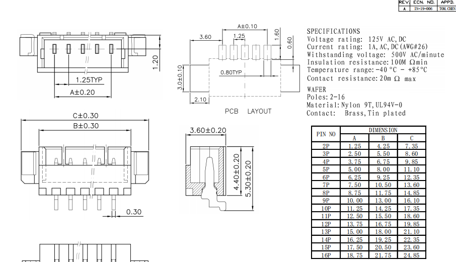 針座 1*2P 間距1.25mm90度 貼片(臥貼)數(shù)據(jù)手冊PDF下載