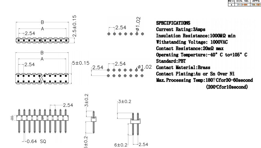 排針 單塑 2*10P間距2.54mm 180度直針(方針)數(shù)據(jù)手冊PDF下載