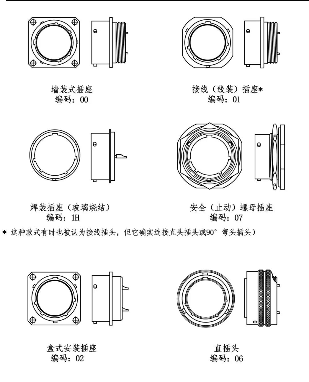 墻裝式插座、接線式插座、焊裝插座、安全螺母插座、盒式安裝插座、法蘭盤安裝插座和直插頭、彎頭插頭等。