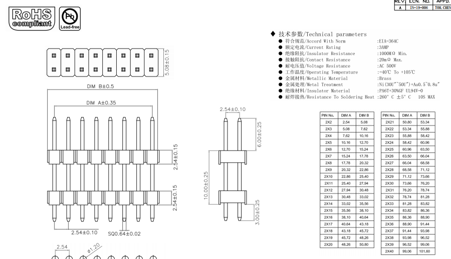 排針 雙塑 2*7P 間距2.54mm 180度直針數(shù)據(jù)手冊(cè)PDF下載